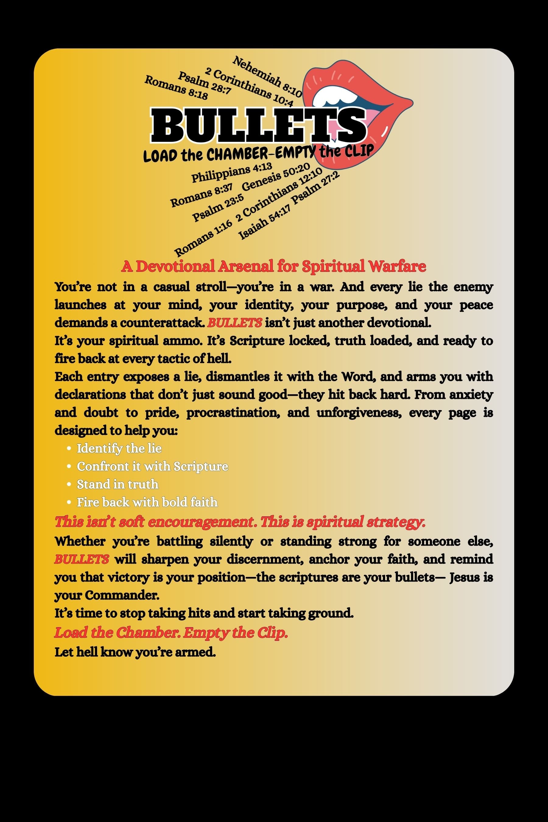 This powerful book is more than encouragement—it’s an arsenal. Born from sermons, seasoned through personal storms, and confirmed by her own daughter’s prophetic request—“Mama, I need this book. A book of bullets”—Bullets is the battle guide every believer needs in their hands and heart.