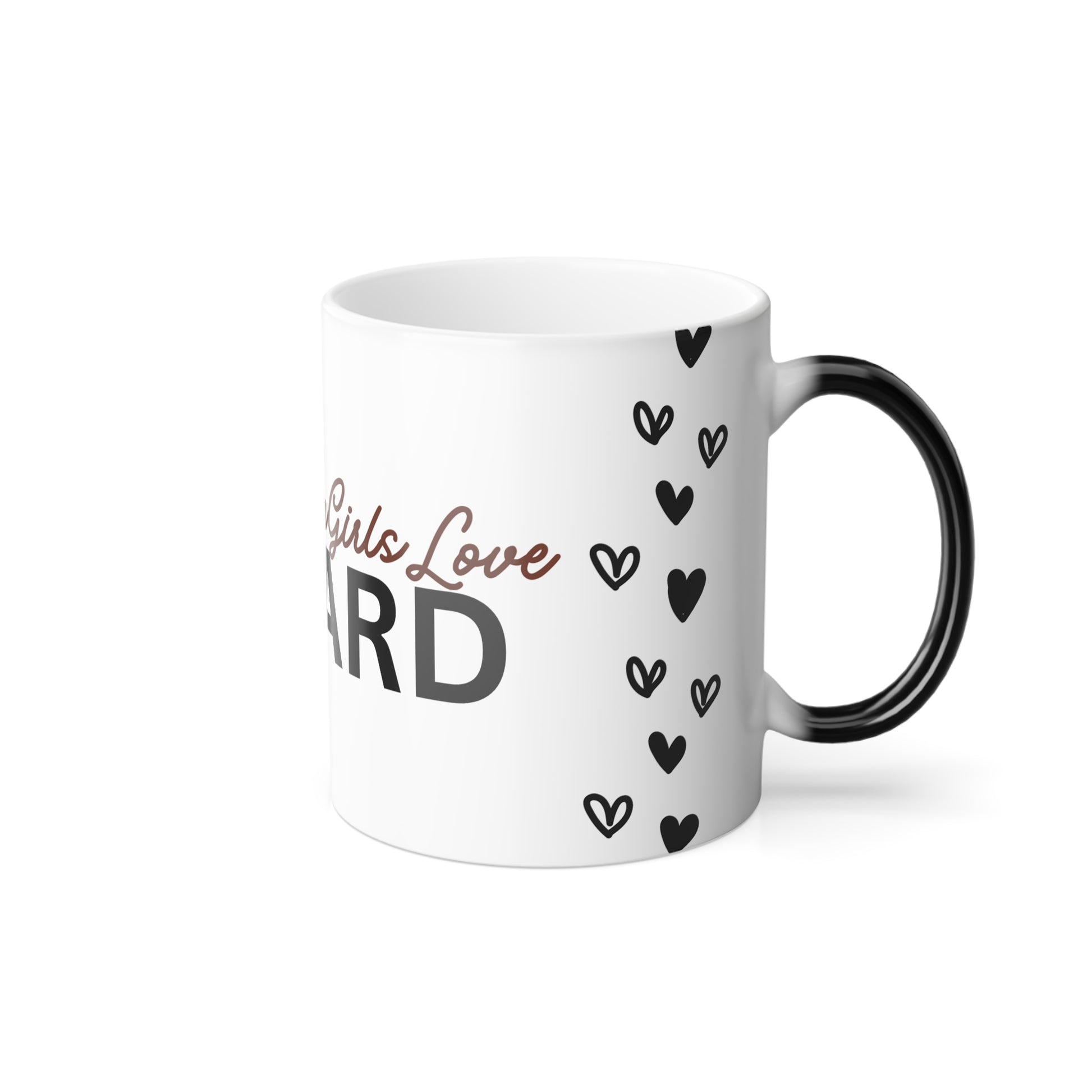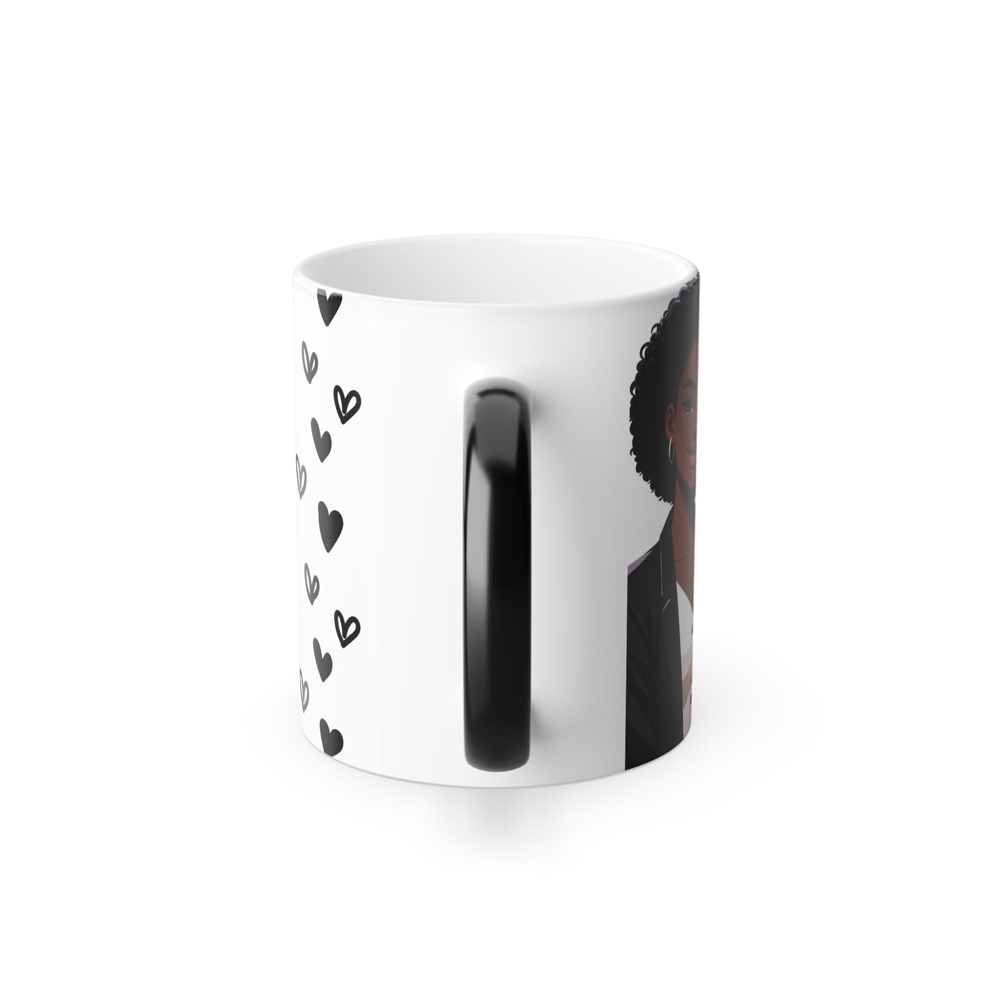 Brown Girls Love Hard Color Morphing Mug, 11oz by Divinely Sown Sister Love Collection. Mugs are super popular gifts for friends and loved ones. This one changes color and will be the gift that keeps on giving. The heat-reactive surface reveals your custom designs once the mug gets warm. The ceramic cup will go back to its original black outside and white inside when it cools down. The C-shaped handle helps keep a sturdy grip.