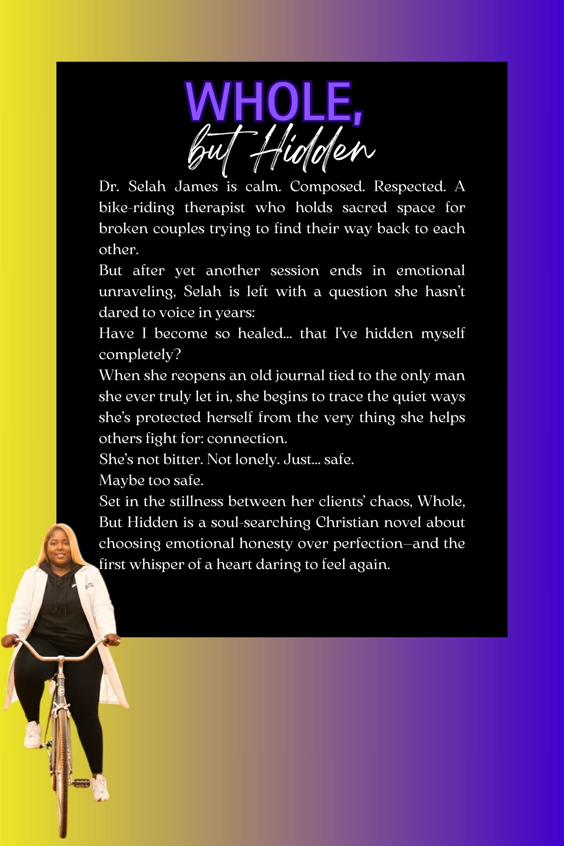 Set in the stillness between her clients’ chaos, Whole, But Hidden is a soul-searching Christian novel about choosing emotional honesty over perfection—and the first whisper of a heart daring to feel again.